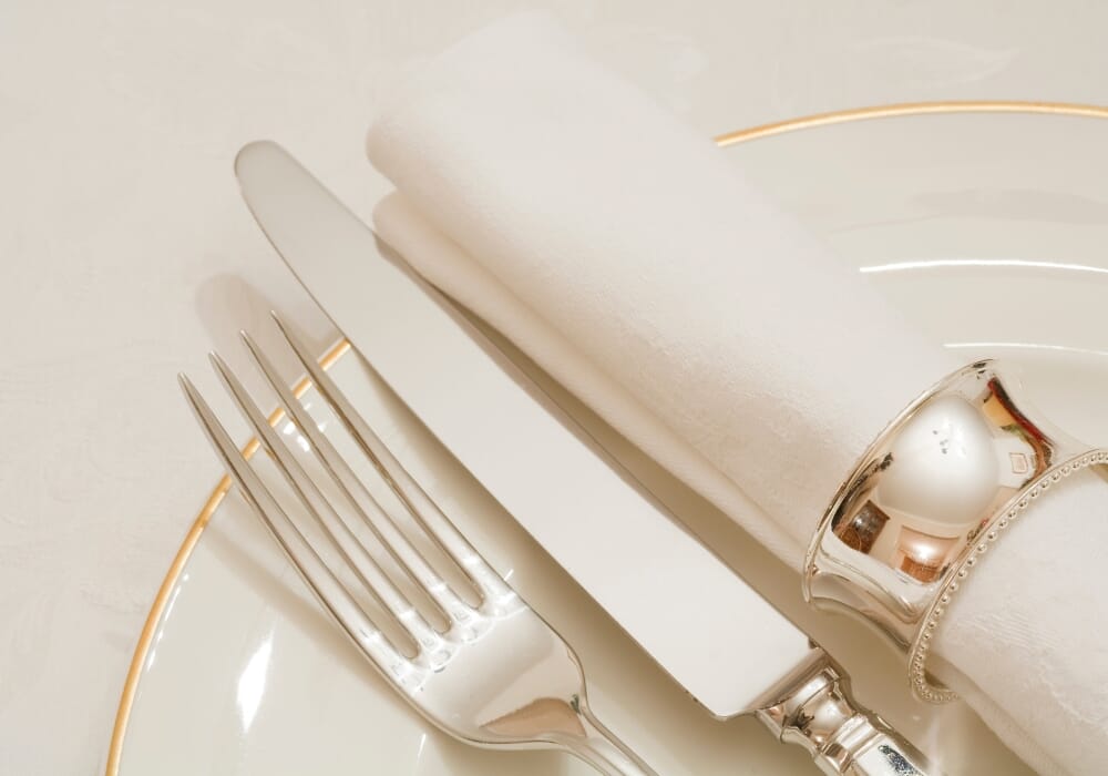 Tovagliato, piatti, posate e bicchieri selezionati per un allestimento elegante e funzionale.